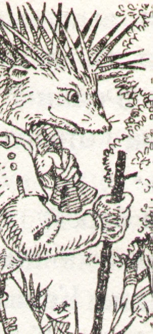 Brink Greyspoke was a fat male hedgehog Cellar Keeper of Redwall Abbey. He was friends with Skipper Banjon, who both accompanied Tiria Wildlough to Log-a-Log Urfa's camp.