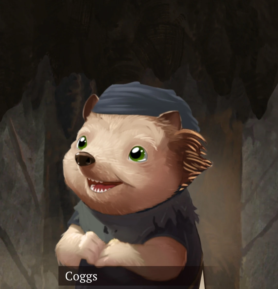 Coggs Stickle was a young male hedgehog who lived in Mossflower with his father Ben, his mother Goody, and three siblings, Ferdy, Spike, and Posy Stickle. Along with his twin brother, Ferdy, Coggs was captured by Tsarmina Greeneyes' Thousand Eye Army to be held as ransom for the woodlanders. In the dungeons of Kotir the brothers befriended the wildcat Gingivere, and the three of them were eventually rescued by the Mask, who was sent by the Corim. They were also close friends with Mask and were only told that he went to a place far away when he died.