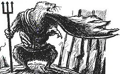 Kharanjul was a savage male Wearet, and the leader of a vermin horde. He was huge, ugly, and muscular, with very little neck and no visible ears. His weapon of preference was a trident. Kharanjul had many titles, among them being Lord of the Abyss and Master of Life and Death. He guarded the fallen Lord of Mossflower, which had become a bridge that spanned the Abyss, and he would kill any who crossed.