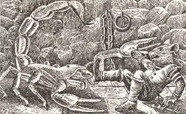 When Fort Bladegirt was attacked, Gabool tricked Rawnblade Widestripe into Skrabblag's pit. Guided by the Spirit of Martin the Warrior, Rawnblade took hold of the scorpion and hurled him out of the pit. Free at last, Skrabblag attacked and killed Gabool. Before the creature could do any further damage, Dandin chopped the vengeful scorpion in half with the Sword of Martin.