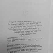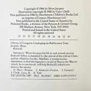 Generally, when you're looking for a true first edition of a book, sometimes described as the first print run or the first impression, you want to check the copyright page. Right above the Library of Congress data and below the publisher data, you'll spot a string of numbers. If you see a 1 anywhere in that string, congratulations you’ve located a first edition book! However, this is not the case with Redwall.