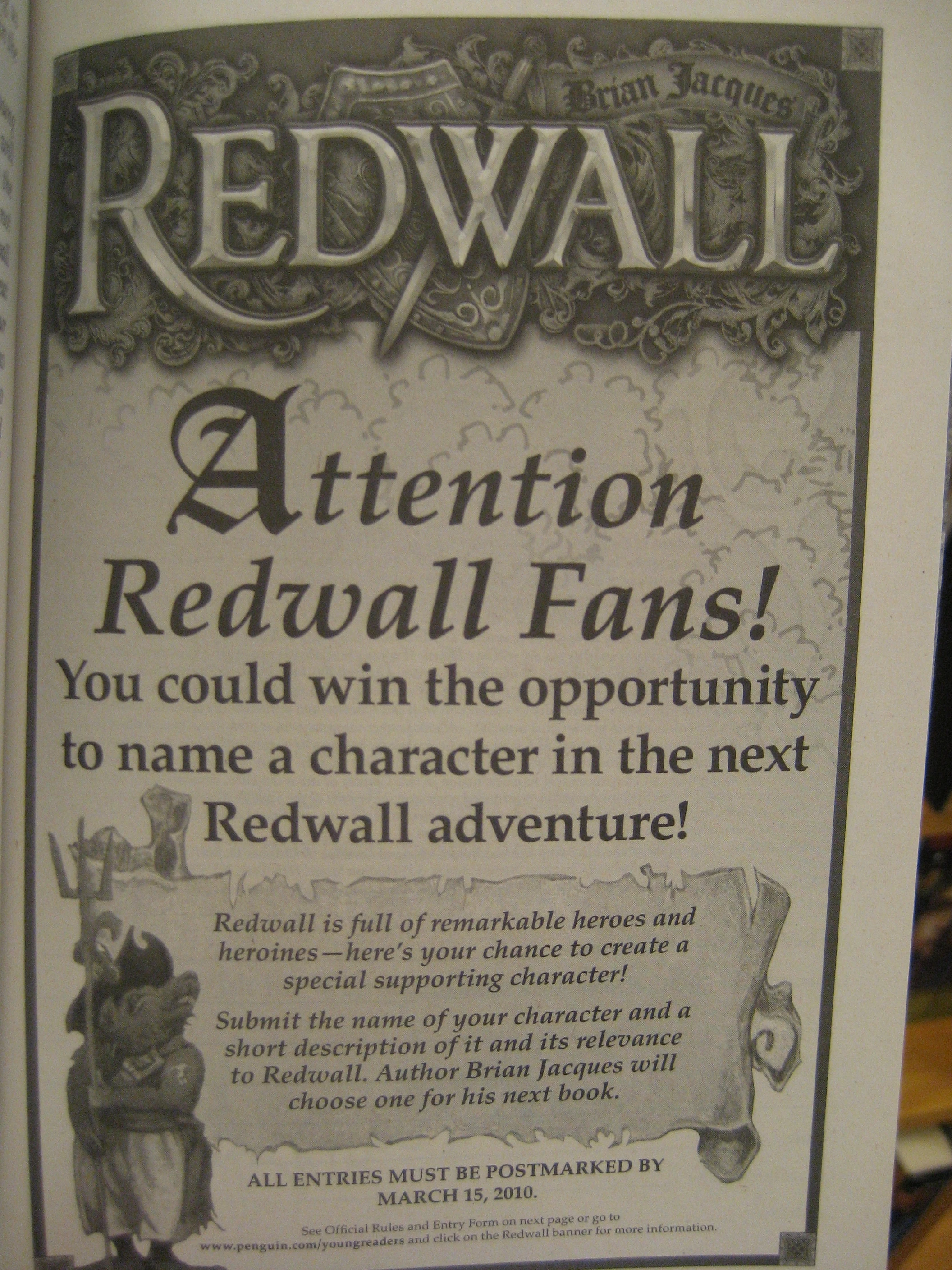 However, Brian Jacques was almost always a year ahead in writing his books - it was certainly possible that the "next" novel for the contest winner's character was actually supposed to be a future book, even though the rules stated "One Grand Prize winner's ("Winner") proposed character name will be given to a minor character of the author's choosing in the upcoming Redwall book to be published in or around Spring 2011".